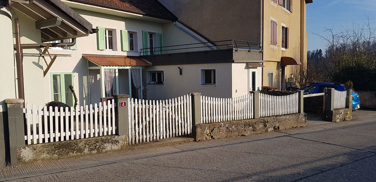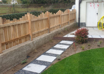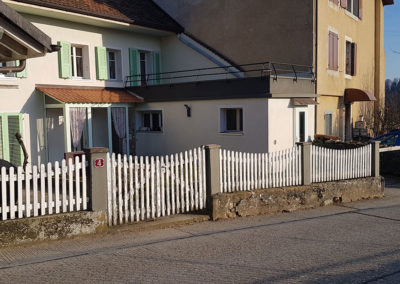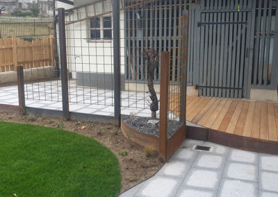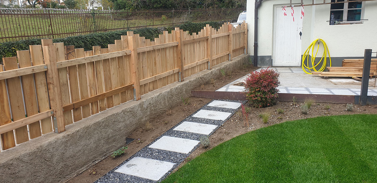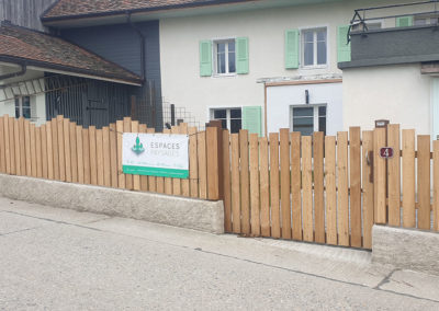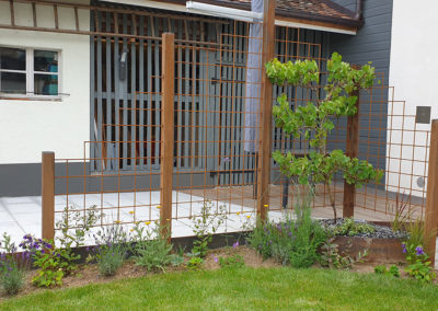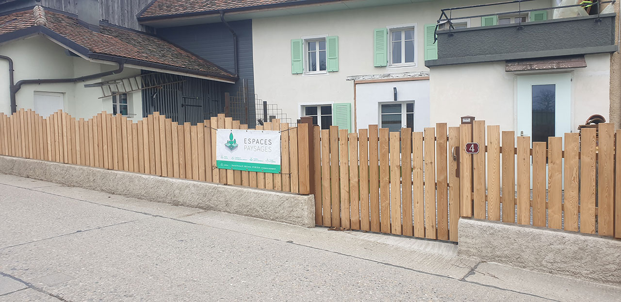 Un aménagement esthétique, conceptuel-naturel est sorti de terre ici avec un coin terrasse (deux fois intimisé par la clôture sur mesure en mélèze en bord de route et par la nouvelle treille originale en acier rouillé créée pour la vigne conservée au bord de la terrasse, parasol réglable coulissant intégré à un poteau de la treille, terrasse arrondie en mélèze, jeu de courbes pour casser les angles et optimiser la circulation, quinconces, irrégularités (treille, clôture) pour Créer du rythme. Chemin périphérique en dalles et pavés naturels, acier, bois, rien de préfabriqué à l’exception du muret d’entrée qui a du être refait en ‘dur’, crépis à l’ancienne au mortier bâtard. Portail coulissant avec notre même parement mélèze que la clôture et poteaux couleur rouille pour être dans l’harmonie avec les matériaux. Un joli petit aménagement fonctionnel et paysager, avec des matériaux naturels, comme nous aimons tant les réaliser !