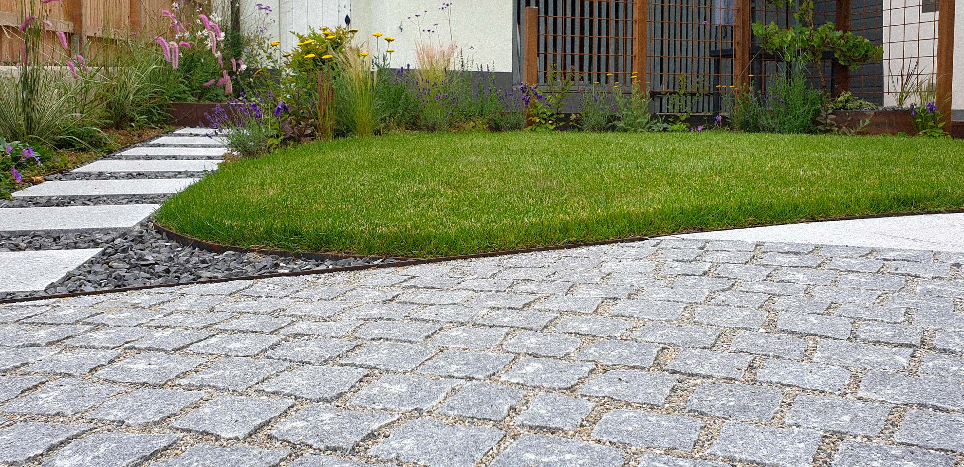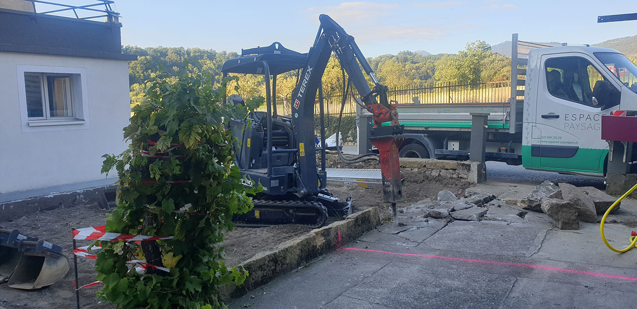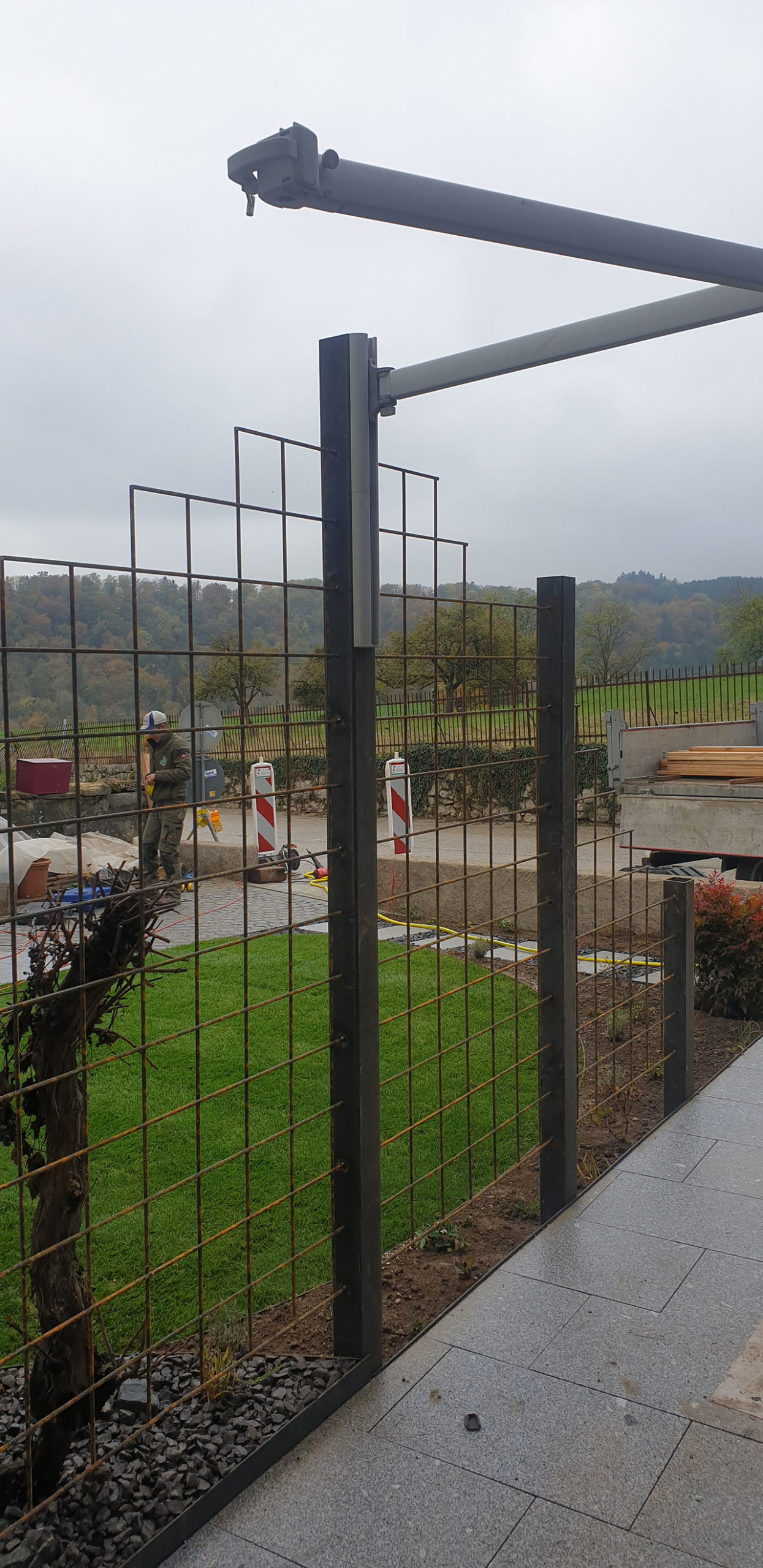 Un aménagement esthétique, conceptuel-naturel est sorti de terre ici avec un coin terrasse (deux fois intimisé par la clôture sur mesure en mélèze en bord de route et par la nouvelle treille originale en acier rouillé créée pour la vigne conservée au bord de la terrasse, parasol réglable coulissant intégré à un poteau de la treille, terrasse arrondie en mélèze, jeu de courbes pour casser les angles et optimiser la circulation, quinconces, irrégularités (treille, clôture) pour Créer du rythme. Chemin périphérique en dalles et pavés naturels, acier, bois, rien de préfabriqué à l’exception du muret d’entrée qui a du être refait en ‘dur’, crépis à l’ancienne au mortier bâtard. Portail coulissant avec notre même parement mélèze que la clôture et poteaux couleur rouille pour être dans l’harmonie avec les matériaux. Un joli petit aménagement fonctionnel et paysager, avec des matériaux naturels, comme nous aimons tant les réaliser !
