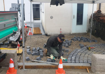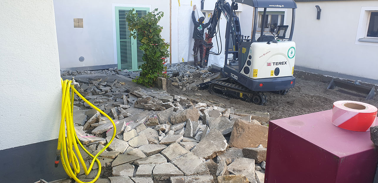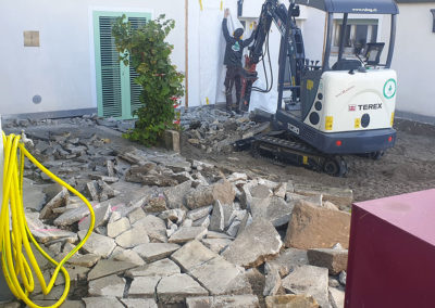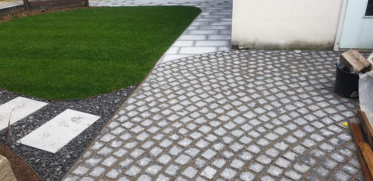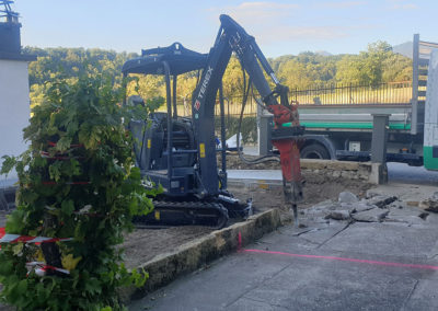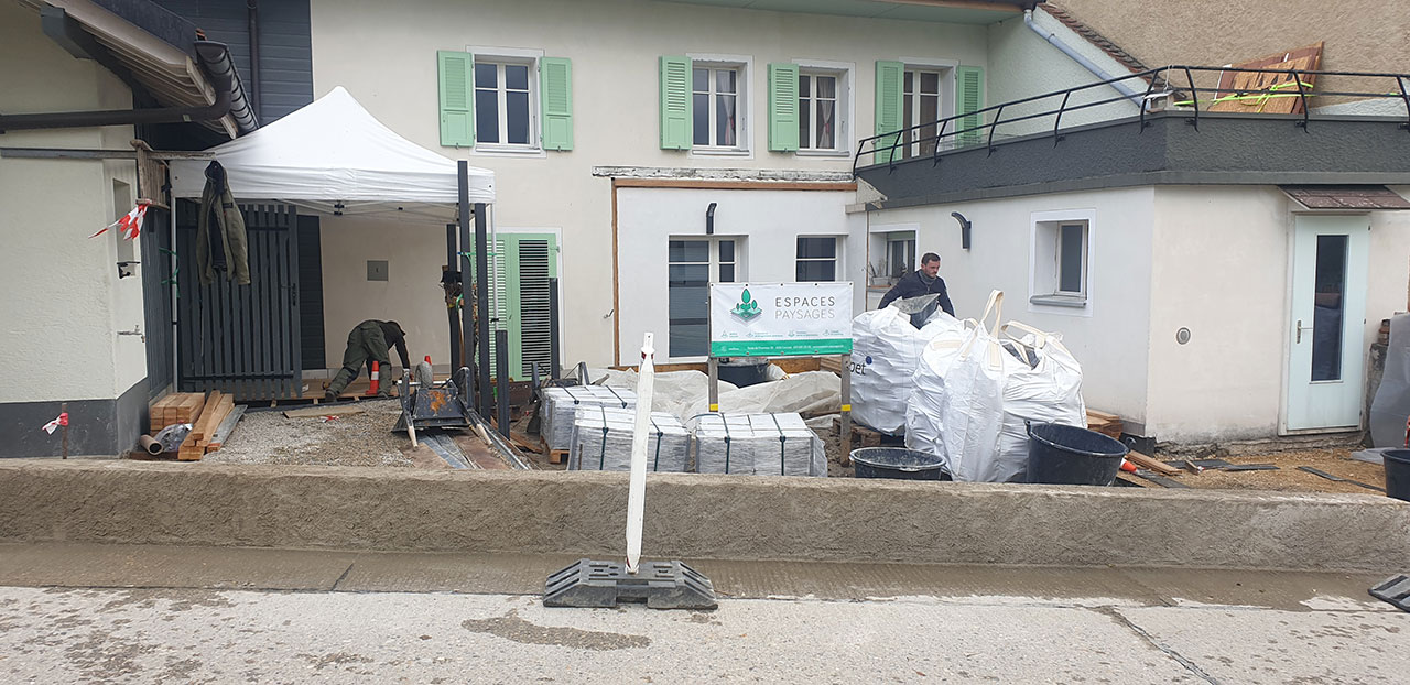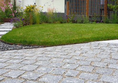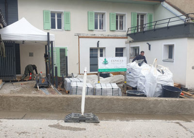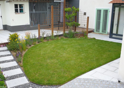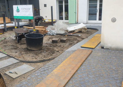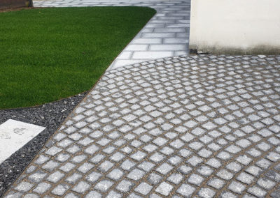 Réaménagement complet de cette cour à multiples fonctions : en effet il s’agit en même temps de la cour d’entrée, du jardin, de l’accès à la buanderie ainsi qu’à un réduit et à la place de parc d’une moto.