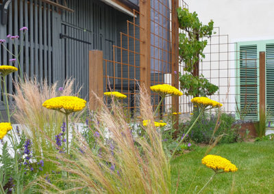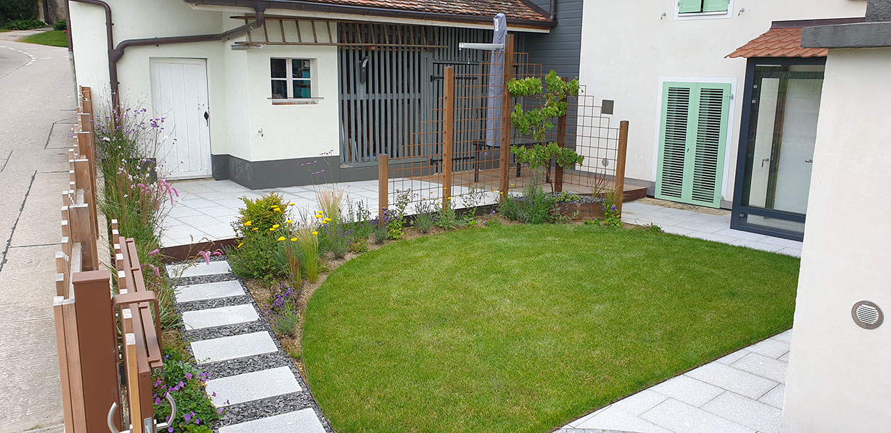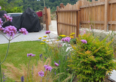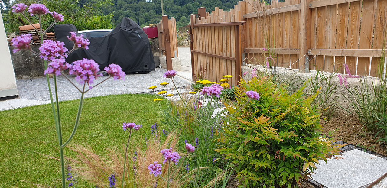 Plantation de vivaces à fleurs et mellifères et petit île de verdure en cerise sur le gâteau. Cour transformée à Fiez, région Yverdon, Grandson.