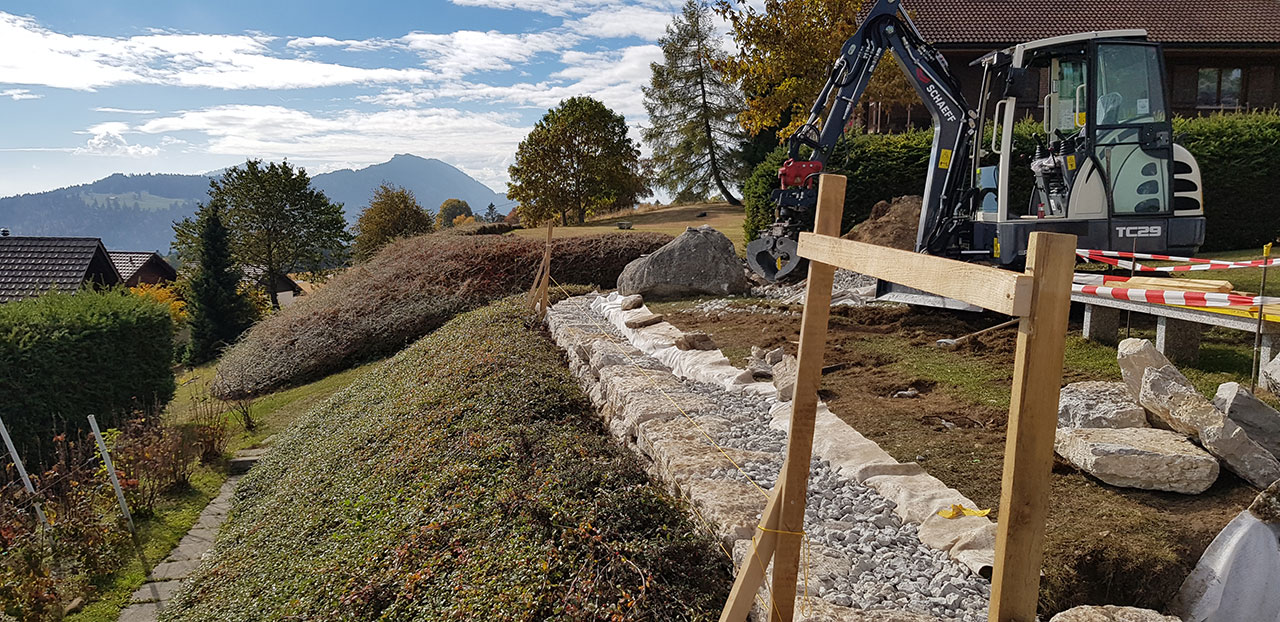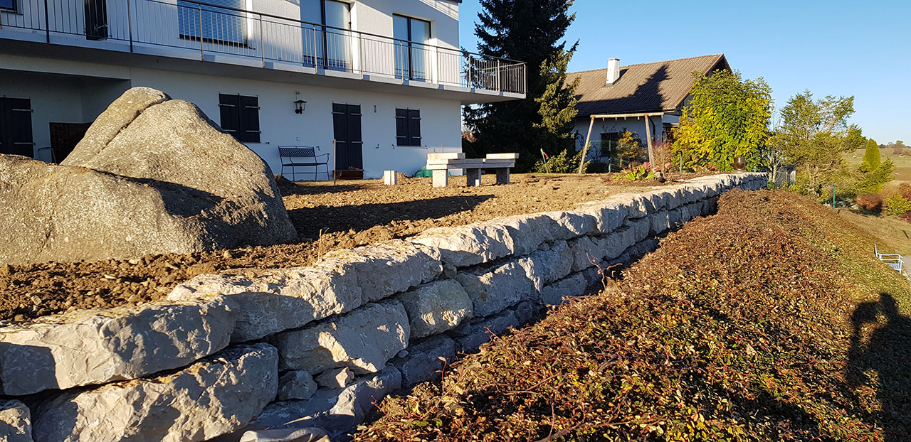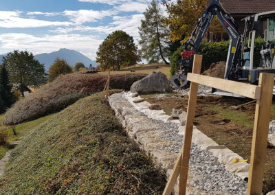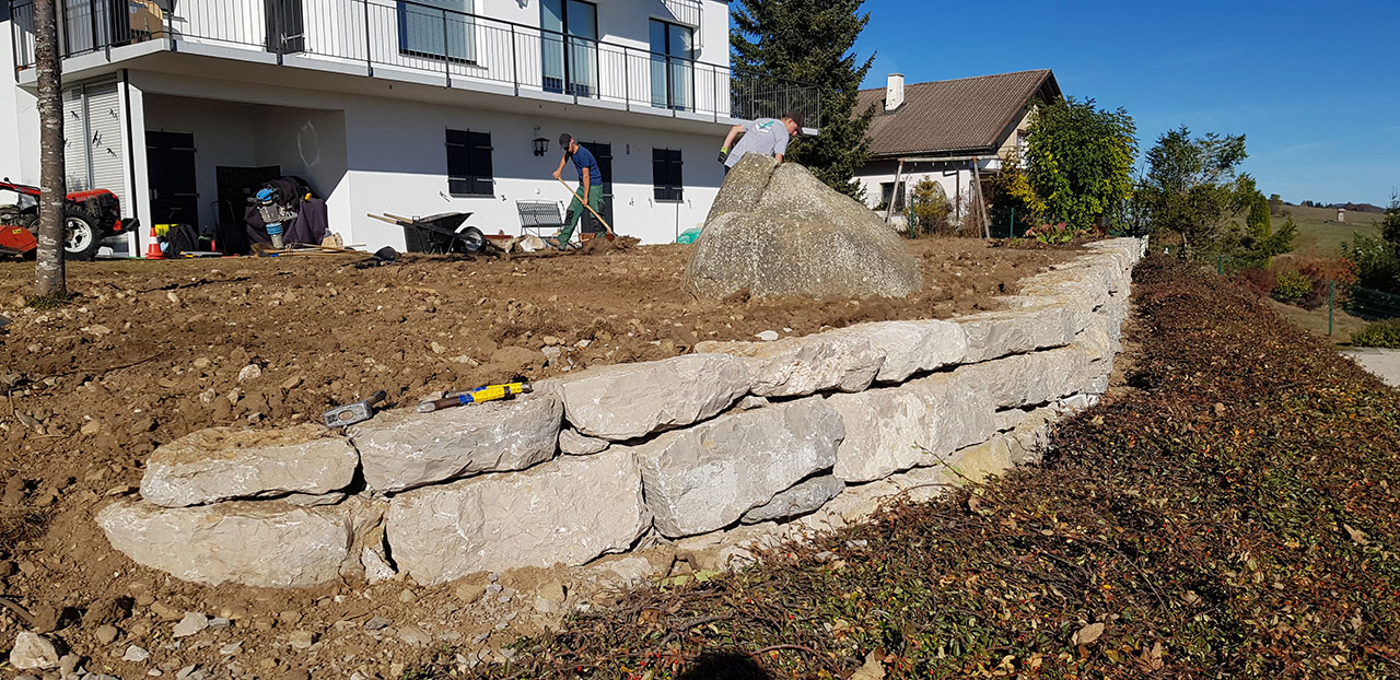 Création d’un muret pour aplanir et agrandir le jardin. L’enrochement est la variante bon marché des murs en pierre, pour des situation où le budget ne permet pas l’installation d’un mur en pierre sèches, qui est effectivement plus onéreux mais dont les qualités esthétiques et écologiques sont nettement plus intéressantes!