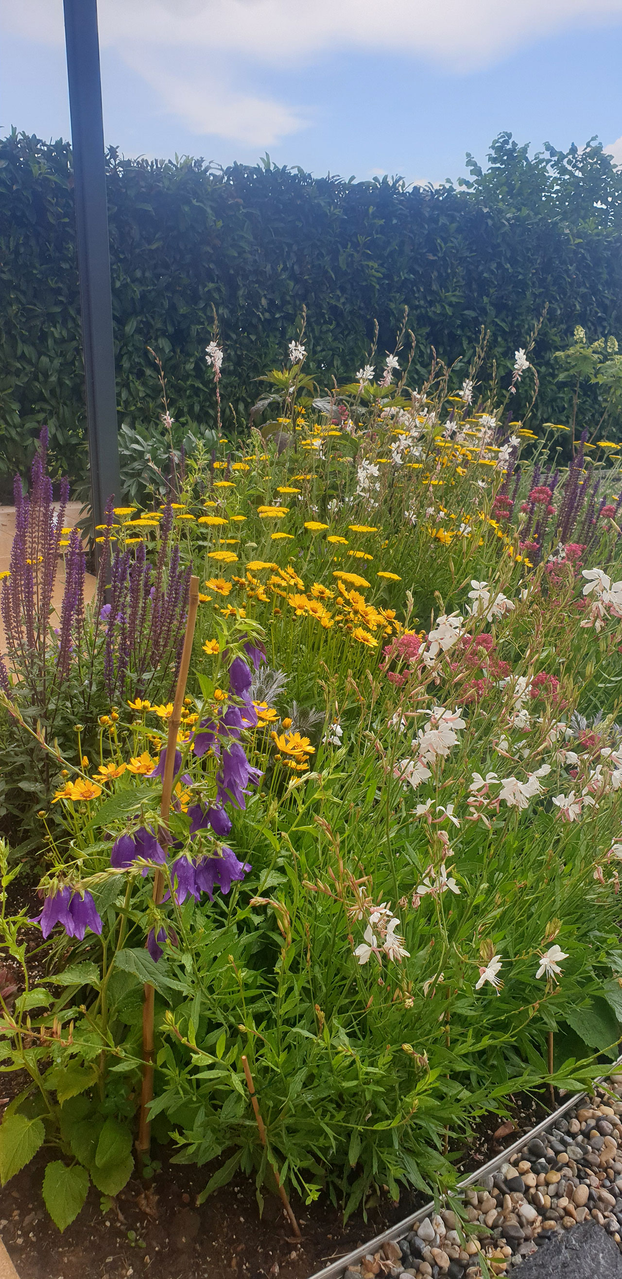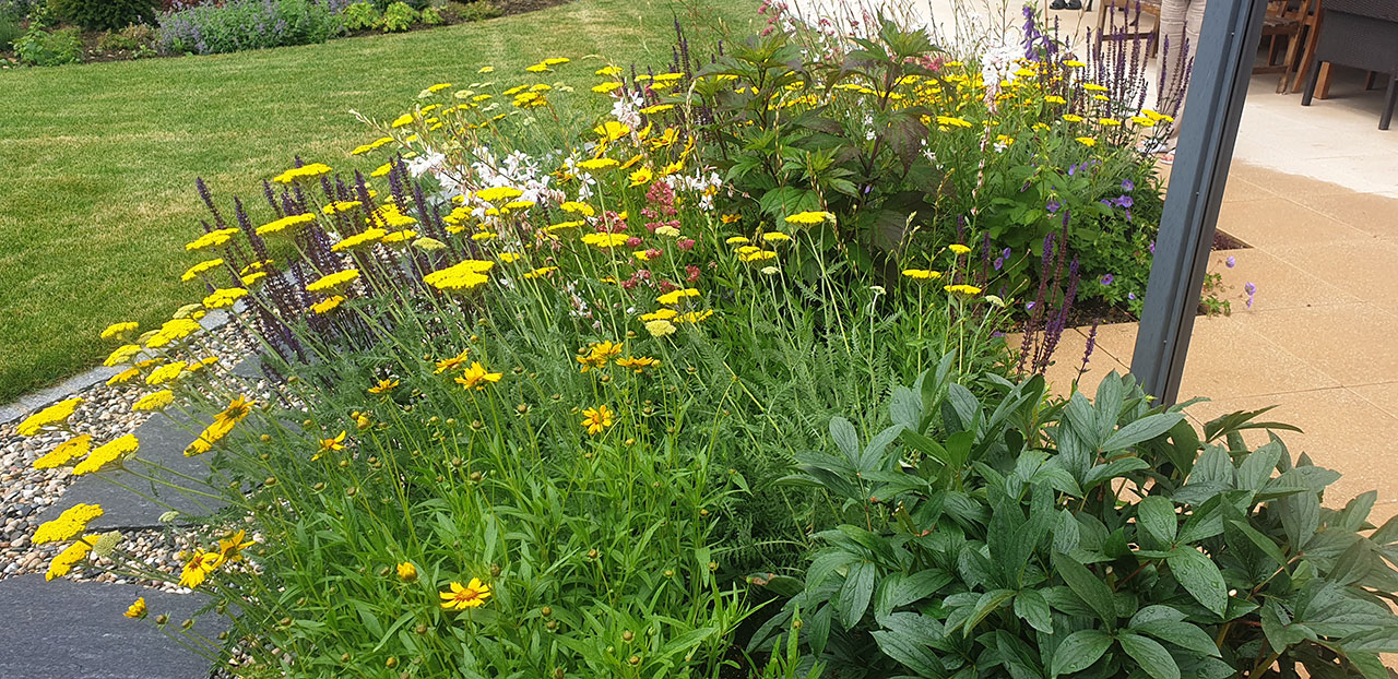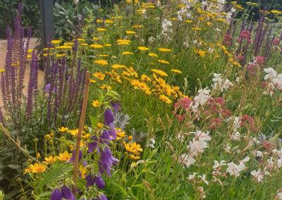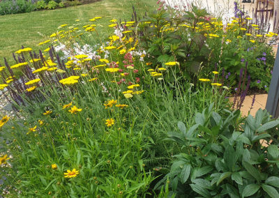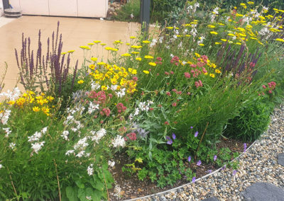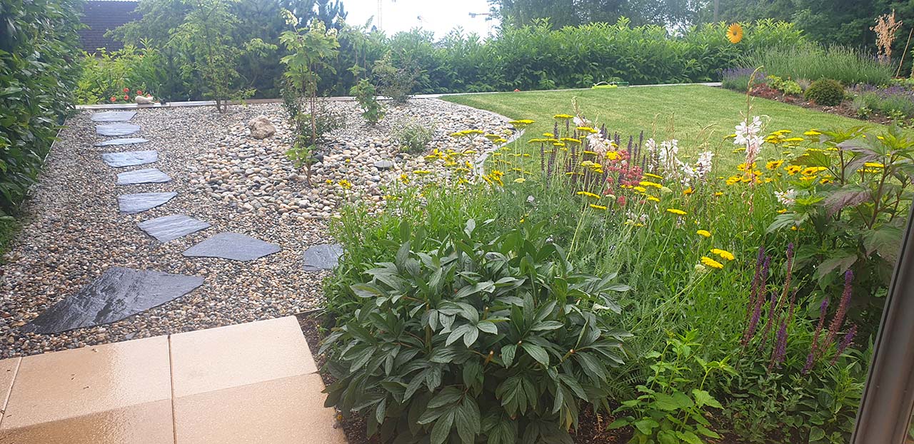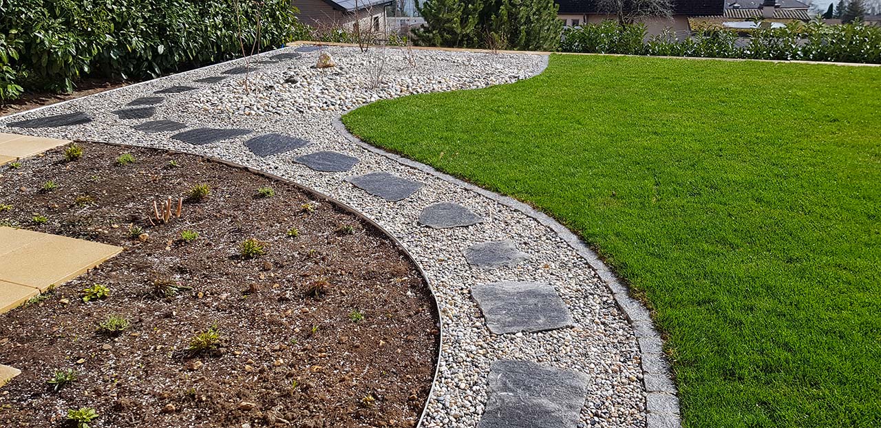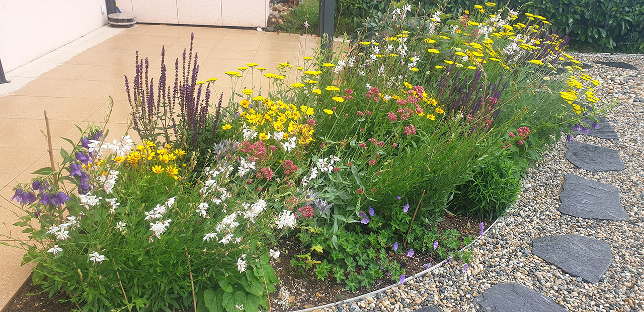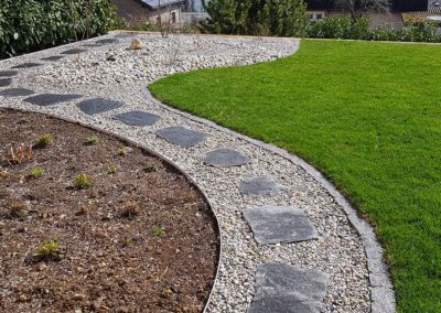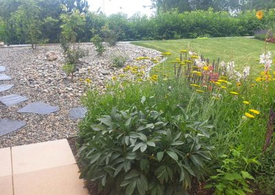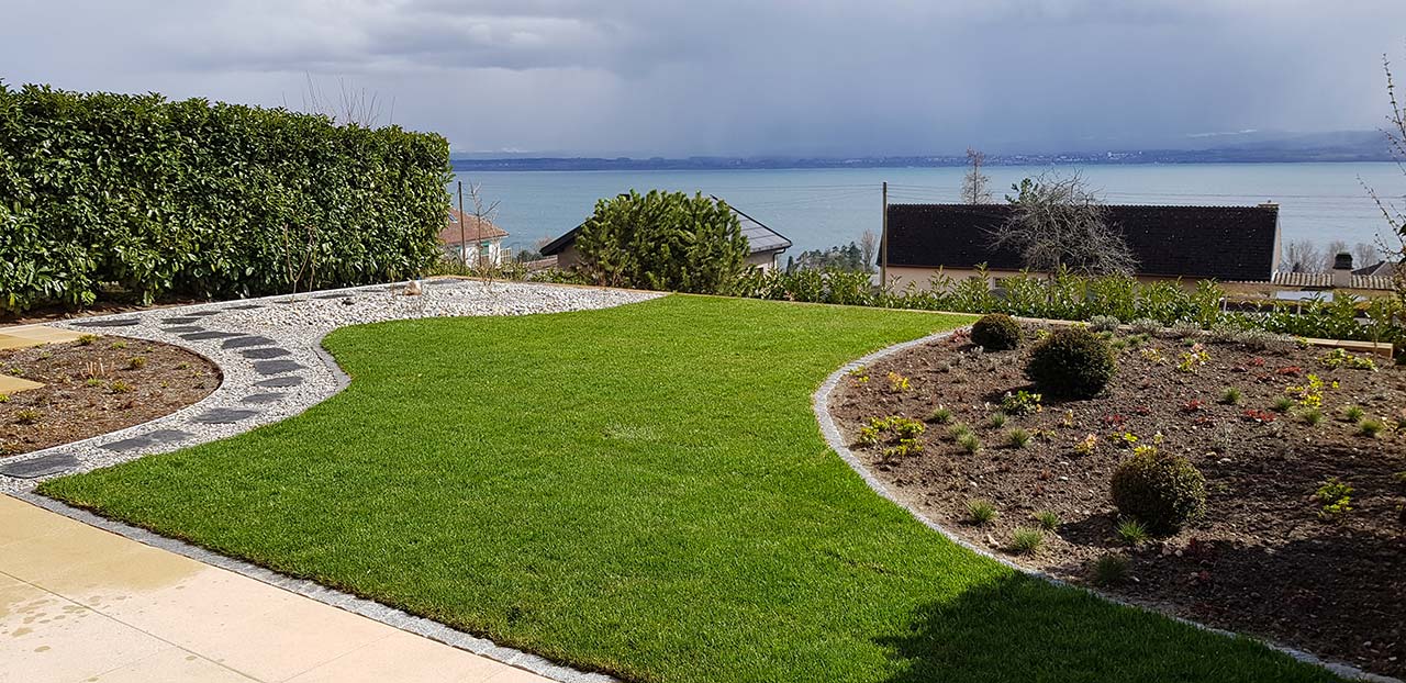 Transformation d’un jardin selon le souhait de notre client : gagner en espace tout en diminuant l’entretien et la surface de gazon. Nous avons donc créé un muret en traverses de chêne de la région pour aplanir une partie du talus difficile d’accès, créé des massifs dont un semi minéral pour faciliter l’entretien, un de vivaces tapissantes dont une partie indigène sur une partie exposée au vent, ainsi qu’une belle platebande de vivaces à fleurs le tout délimité par une belle bordure en pavés naturels une fois de plus afin de simplifier l’entretien tout en mettant en valeur.Plaquage d’un gazon pré cultivé produit en suisse et résistant au sec sur la petite surface de gazon. Semis d’une prairie fleurie indigène dans le talus.