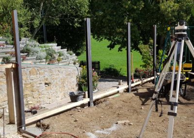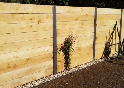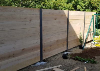 Une palissade entièrement réalisée par nos soins, sur mesure, avec poteaux en acier coulisse soudés dos à dos puis garnis de planches de chêne brut des forêts avoisinantes débitées par une scierie de la région.
