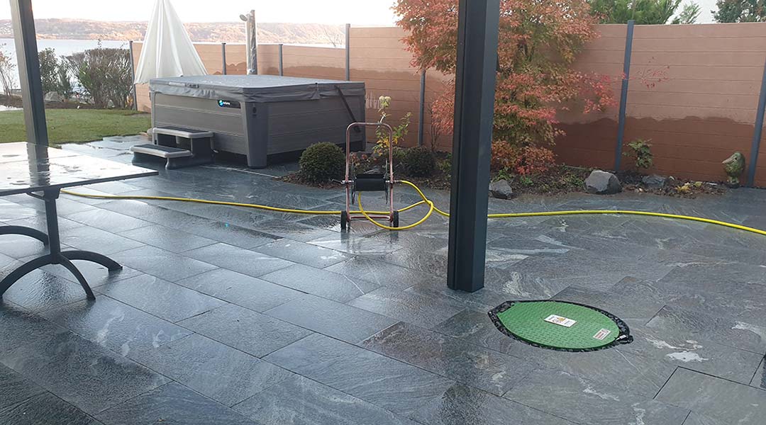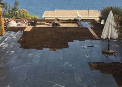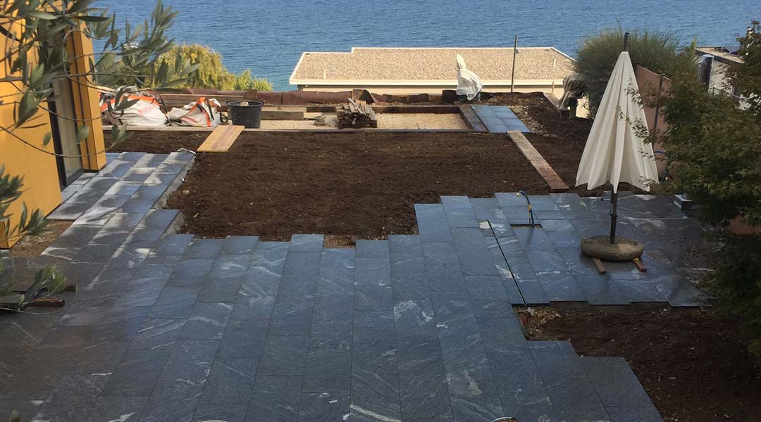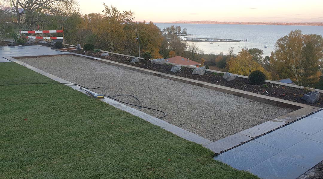 • Les terrasses en béton ont été remplacées par du gneiss Suisse scié grenaillé, très esthétique, durable et fonctionnel, donnant à ce jardin une profondeur et la sensation d’être perché sur le lac de Neuchâtel lorsque les dalles sont mouillées.